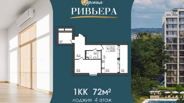 Студия 22,6 м с отделкой под ключ и глубокой лоджией-аэрарией. Находится лот на 8 этаже, откуда открывается завораживающий вид на лес. »Морская Ривьера...