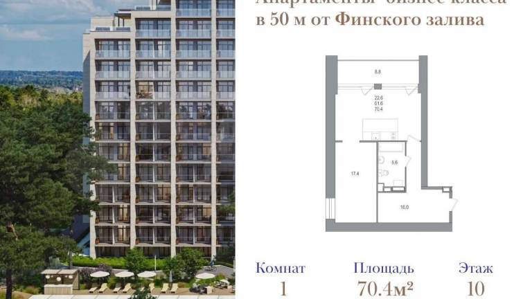 Фильтры2Продаются просторные 1-комнатные апартаменты у самого берега Финского залива. Вид на залив! Идеально для жизни и отдыха. Площадь 70,4 м, высокие потолки до 3м...
