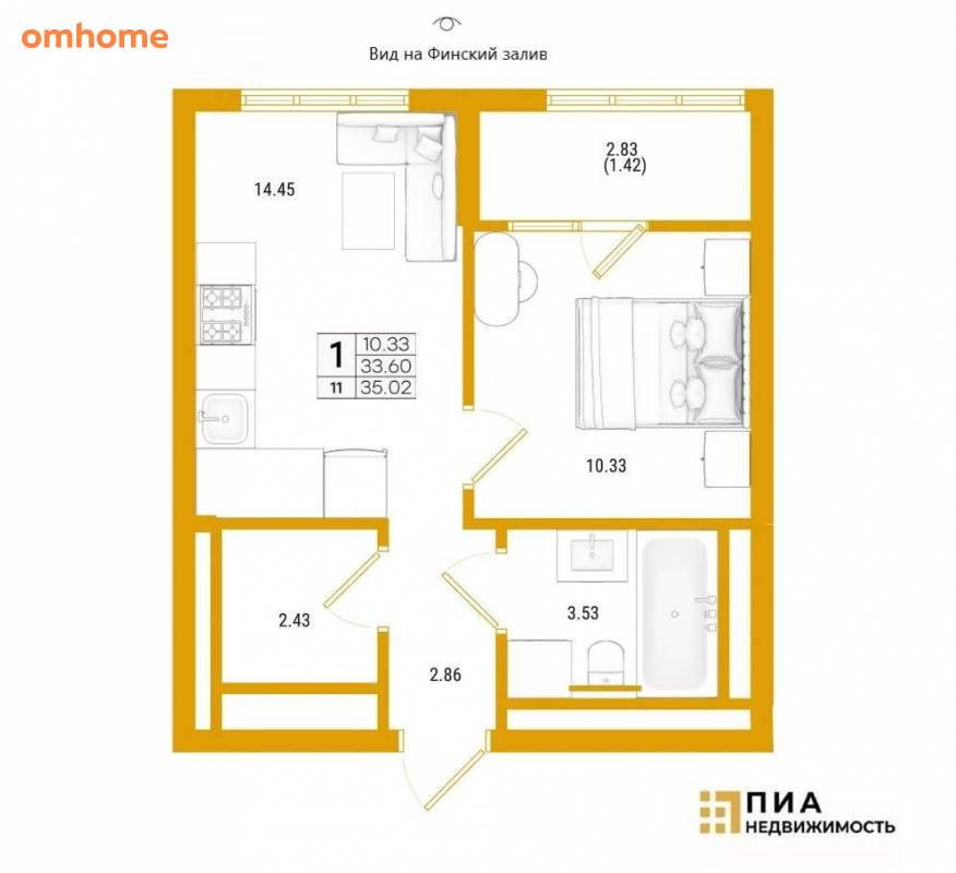 Продажа 1-комнатной квартиры 35,02 м²