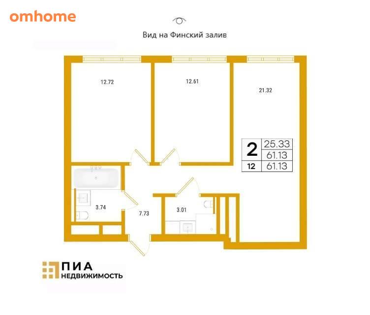 Продажа 2-комнатной квартиры 61,13 м²