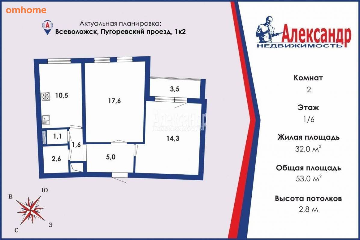 Продажа 2-комнатной квартиры 53 м²