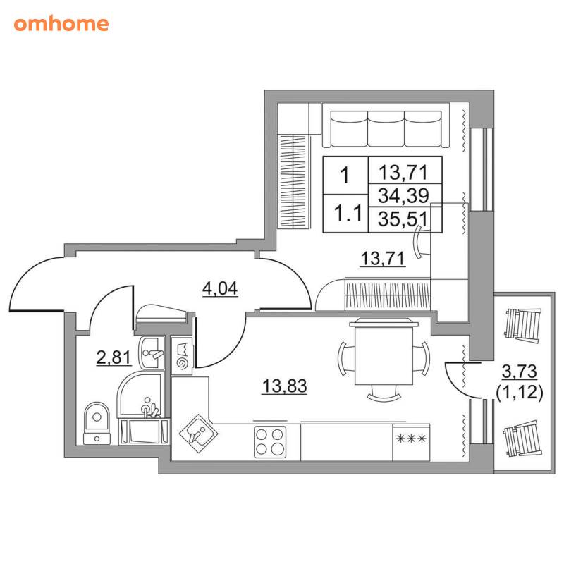 Продажа 1-комнатной квартиры 34,2 м²