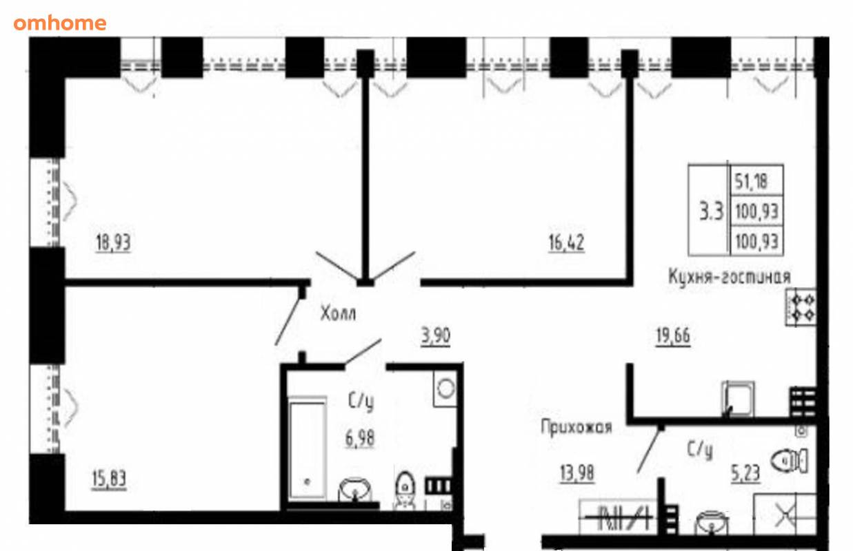 Продажа 3-комнатной квартиры 100,93 м²