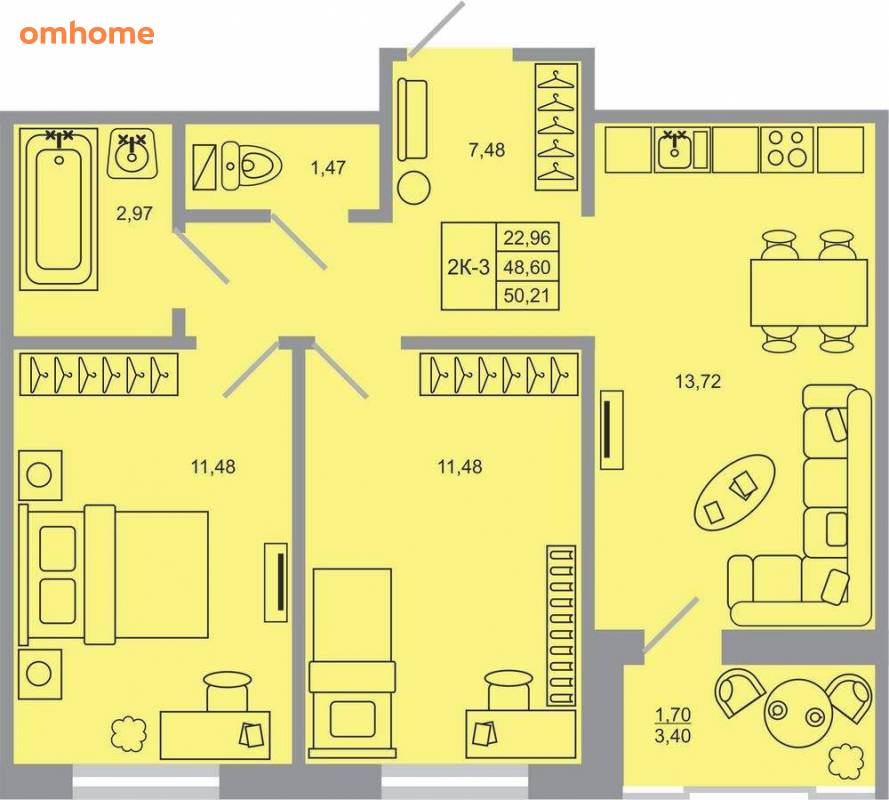 Продажа 2-комнатной квартиры 50,21 м²