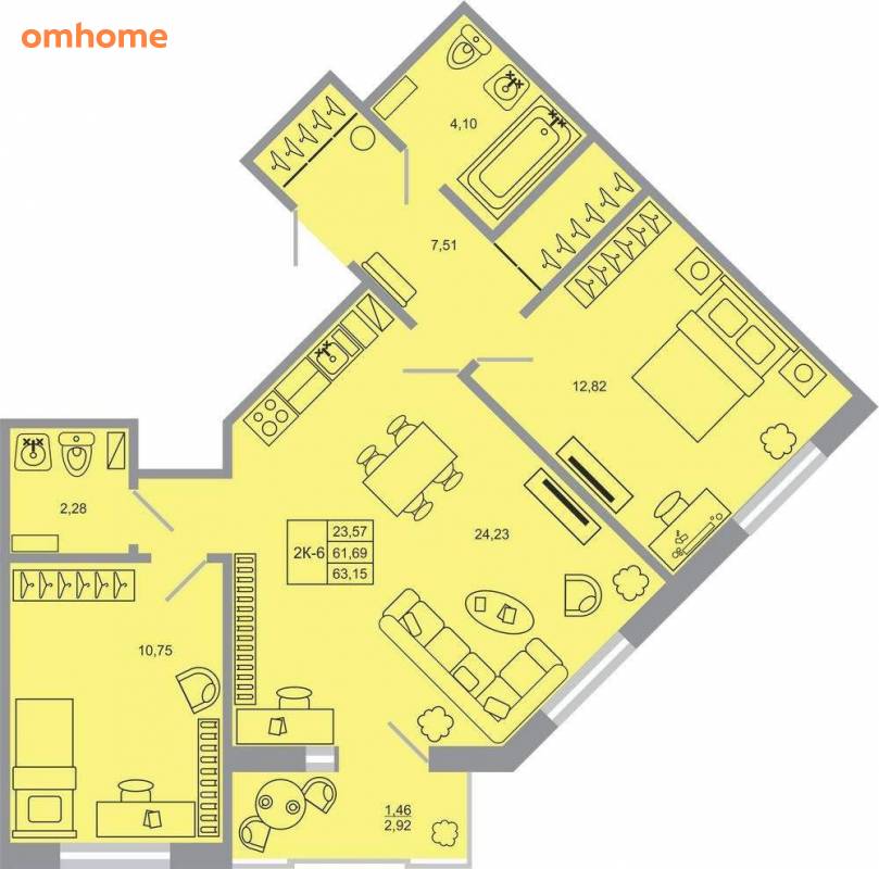 Продажа 2-комнатной квартиры 63,4 м²